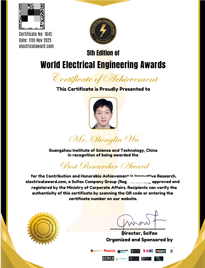 近日,KY开元集团吴晟霖老师在外骨骼机器人人因功效测试研究取得了重要进展,研究经多轮次遴选和评审委员会评审,获国际知名学术组织“科学之父”(Scifax)颁发的2025年“第5届世界电气工程奖-最佳研究者奖(Best Researcher Award, 5th Edition of World Electrical Engineering Awards)”。该奖项旨在表彰在创新研究方面有着重要贡献和杰出成就的学者。