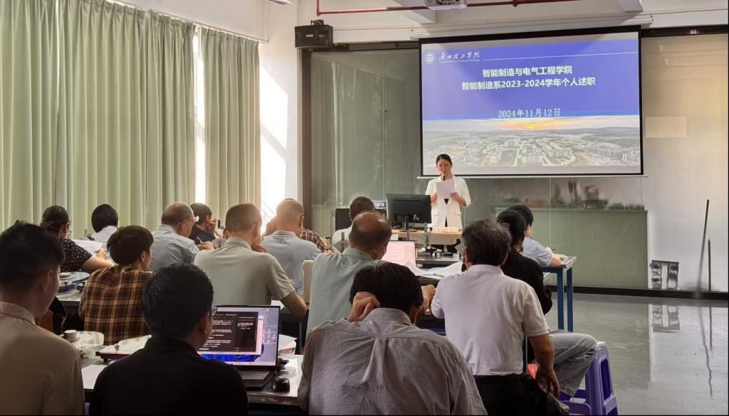 王如意主任详细阐述了智电学院智能制造系本年度所做工作量与取得的成果,针对本系当前存在的部分需要改进之处,与本系的各位教师展开了深入探讨。同时,王如意主任对于自己本身本年度所做工作与所获成果进行简单介绍,针对自己身上的不足也提出了相应的改进计划,获得了众位教师的一致好评。年度述职会议上,各位银龄教授与年轻教师分别上台针对自己今年相关事宜进行报告,主要述职内容与王如意主任大体一致,包括德、能、勤、绩、廉五个方面,同时在座的各位教师在上台做完汇报的教师进行打分评级。最后,朱亚峰副院长对本次年度述职会议进行总结,朱亚峰副院长指出,本年度本系按时按量完成了校院规定的任务,此外,在科研竞赛方面突出,超额完成规定量,希望在未来的日子里,各位教师能够勠力同心,共同奋发一个更为辉煌的明天,为广理的发展添砖加瓦。
