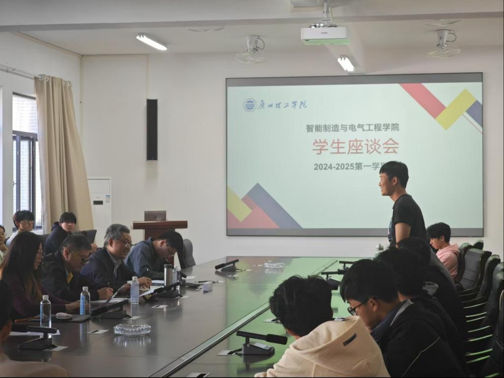 为了解我院2024级学生在学习、生活等方面的问题,回应学生关切,11月28日下午,我院在惠州校区行政楼203会议室召开2024级学生座谈会,本次座谈会有副院长孟遂民,电气系副主任黄浩,智能制造系副主任庞姗,电子系副主任朱建兴及部分教师代表、24级43位学生代表共同参加。