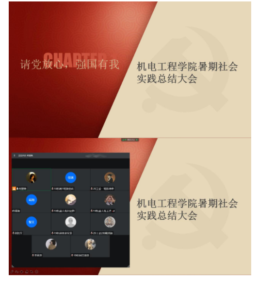 8月24日,机电工程学院暑期社会实践队开展线上社会实践总结大会,队长召开线上会议,对本次社会实践进行总结。首先是各个队员依次发表自己对此次社会实践的认识和收获,并整理好各队员的个人实践报告和实践日记,对最后上交各项材料做收尾工作。