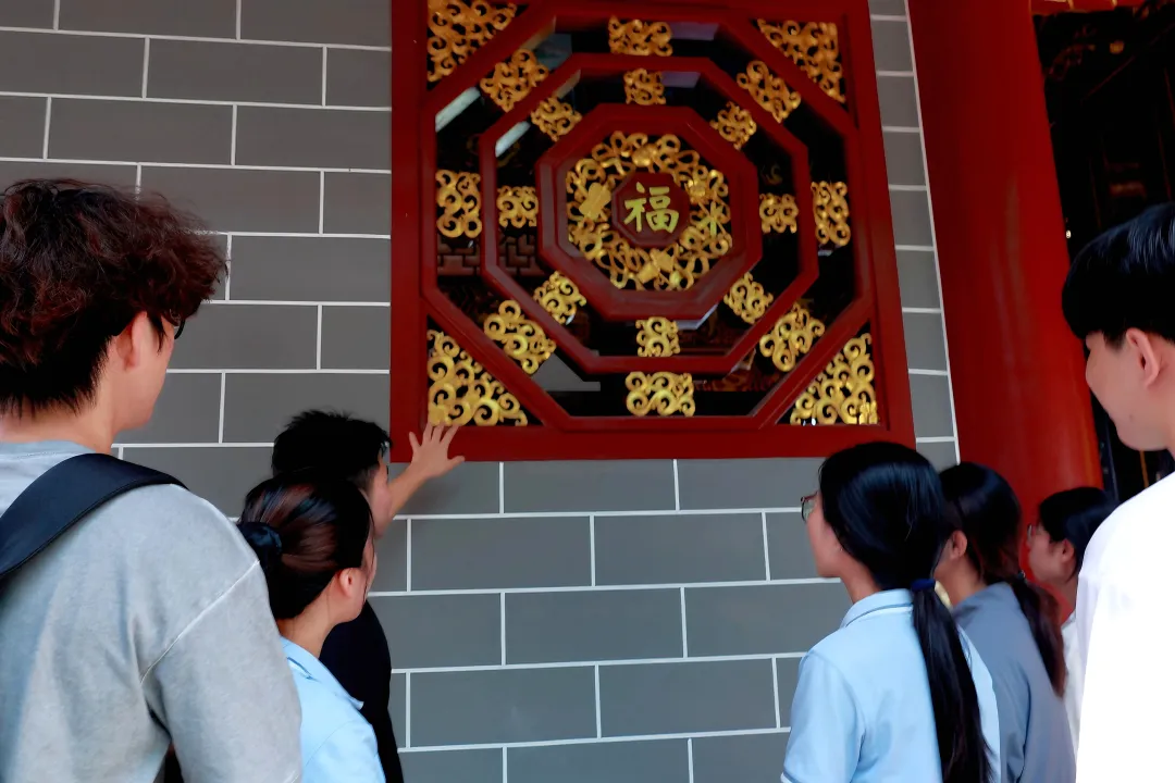 眼前的木雕窗饰极为精巧,红框勾勒八角轮廓,金色纹样如灵动云浪翻卷,中心“福”字古朴,传递着潮汕人对生活的祈愿。队员们凑近细观,触摸纹理间的岁月温度,感受潮阳木雕“以刀为笔”的精湛,在传统工艺之美中,解码潮汕文化密码 。