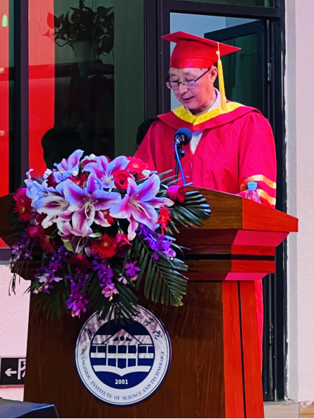 院长李玉忠教授致辞,向全体毕业生送上临别寄语和真挚祝福。李院长细数2023届毕业生四年大学生涯中取得的骄人成绩,回顾了学院近年来在发展中取得的巨大成就。他勉励同学们,要以奋斗书写最亮丽的人生底色,涵养最独特的动人气质;成功的道路是从来都是以挫折为阶梯,希望同学们把困难作为成长的历练,用坚韧的意志支撑起奋斗的人生;希望同学们勇敢肩负起时代赋予的重任,把爱国情、强国志、报国行融入自己的奋斗历程,在新的伟大历史时代,用奋斗书写自己的精彩人生。李玉忠院长深情嘱咐毕业生:“虽然你们即将离开校园,但这里有你们奋斗的青春记忆,是你们梦想起航的地方,无论你们走到哪里,广州理工智电学院永远是你们最温暖的家!母校的大门永远为你敞开,欢迎大家常回家看看!”