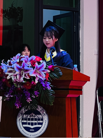 19中兴通信2班曾静丹同学作为毕业生代表讲话。她代表全体毕业生向辛勤培育学生的各位老师,表示最崇高的敬意;向这么多年来辛勤操劳的父母,表达最衷心的感谢;向四年来一起朝夕相处同学们,表达最真诚的祝福,在即将开始新的征程之际,已经做好了准备,会转变角色,全力投入新的征程中,在不断提升中闪耀自身的价值。