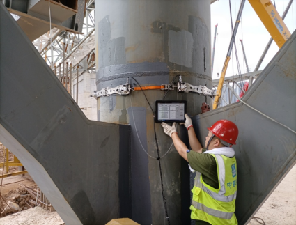 我校声学检测研究所为解决超长、超高和超大的滑道八组钢管混凝土桁式混合巨柱内部混凝土密实度检测与质量评价难题,在前期研究基础上,进行了一系列专项研究试验,开发出新型专用钢管混凝土浇筑质量超声检测系统,本系统在以下方面形成突破:曲面结构非传统对象超声良好耦合;非均质大尺寸结构所需发射大功率超声波激发器;高大构件测点高效定位与换位精准测量;现场复杂环境超声数据高速采集与传输;采用现有规范中的评价技术指标,集成当前国内外新技术指标及人工智能算法。该技术目前已经用于深圳前海冰雪世界项目钢管混凝土巨柱,并持续检测到今年底混凝土浇筑结束。本设备可用于高铁、地铁、公路桥梁及大型建筑等高大柱状构件的施工质量控制环节,也可高效的对这类在役构件内部状态进行超声“透视体检”,为其养护及维修加固方案优化提供技术支撑。