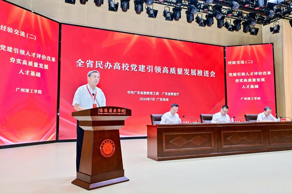 (高敏)7月8日至7月9日,全省民办高校党建引领高质量发展推进会在珠海召开。我校校长胡社军、党委书记黄圣诚、执行董事魏凤琴参加会议。胡社军校长作为全省民办高校代表在会上以《党建引领人才评价改革 夯实高质量发展人才基础》为题作经验交流发言。