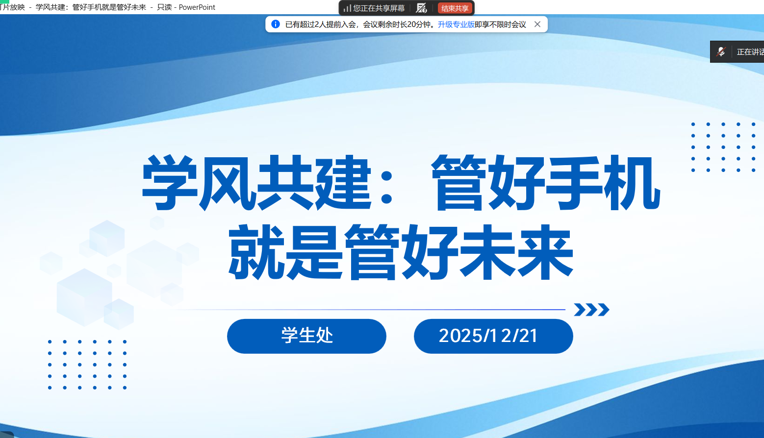 为引导学生合理使用手机,营造良好的学习氛围,12月21日晚,KY开元集团通过线上成功召开“学风共建:管好手机就是管好未来”主题班会,各班辅导员和班长担任主讲,全体学生积极参与。