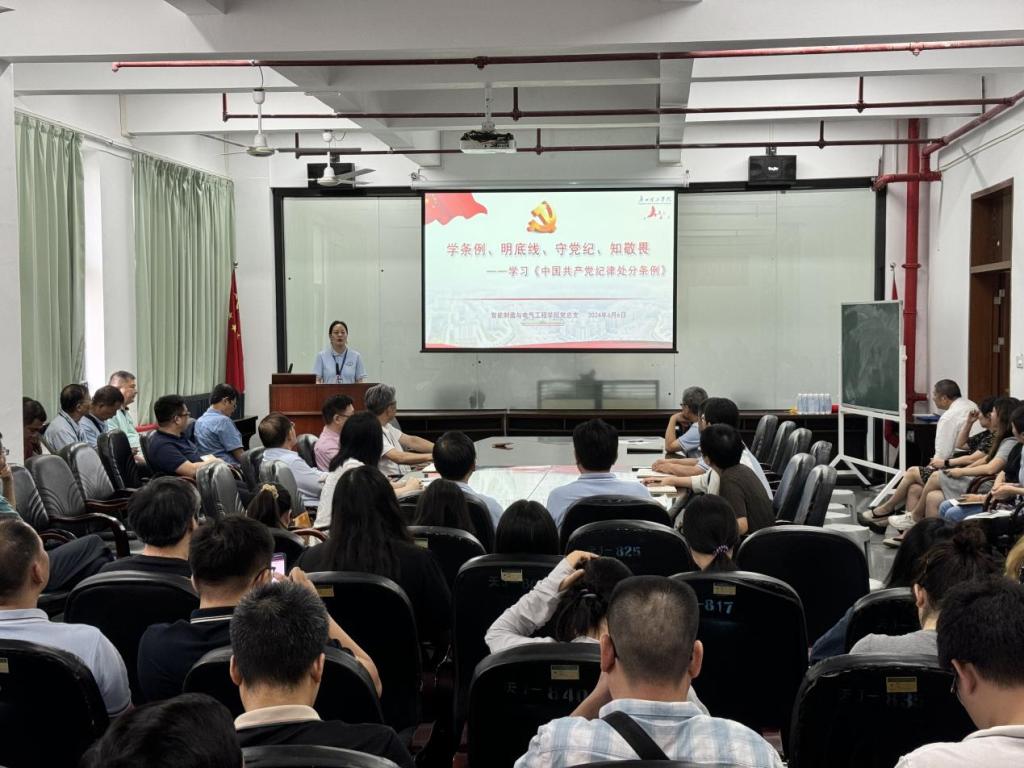 为扎实推动党纪学习教育走深走实,6月6日下午,智电学院党总支书记吕在艳在工程楼211会议室讲授了以“学条例、明底线、守党纪、知敬畏”为题的党课,全院教工参加。