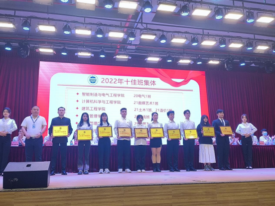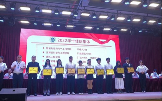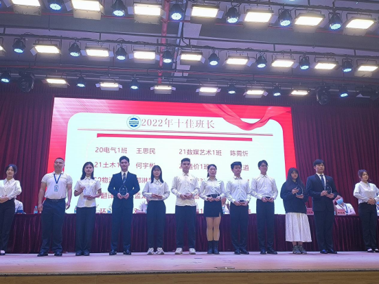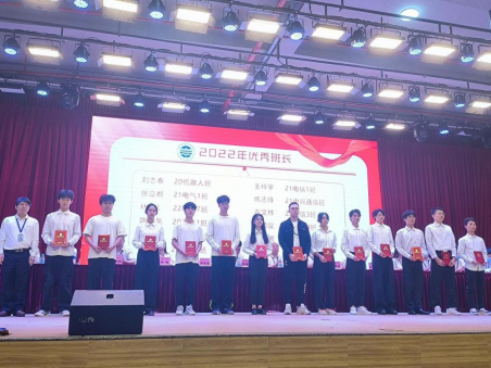 本次优秀学生表彰大会中,智电学院的温岳峰、黄炅杲同学荣获学校“2022年十大年度人物”称号,20电气1班荣获“十佳班集体”称号、19中兴通信2班等7个班级荣获“先进班集体”称号、王思民同学荣获“十佳班长”称号、刘志春等6名同学荣获“优秀班长”称号。