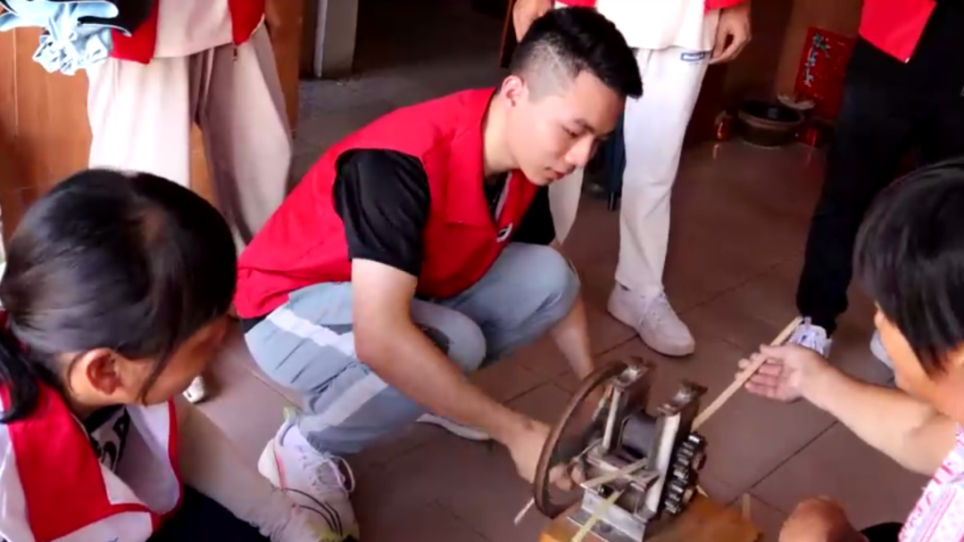 继续深入赤坎村,队员见到了曾在展览馆见过的手摇劈篾机。将处理过的竹条放入手摇劈篾机入口处,转动手柄,机器会带动竹条穿过刀口,将竹条削成薄薄的篾片。随后在洋篮手艺人的指点下,队员们尝试使用手摇劈篾机制作篾片,但即使用了机器的辅助,制作出来的部分篾片仍出现薄厚不均的问题而无法用于编织。体验过手摇劈篾机后,小队更加深刻的体会到编织洋篮的不易,对洋篮手艺人们坚持非遗技艺的精神更加钦佩。非物质文化不只是技艺的传承,也是一种对民族文化的传播与继承。新桥洋篮编织技艺传承至今,离不开传承人们的匠心守护,在新桥有一群人热爱洋篮,传承匠心,以“匠心精神”守护历史传承。