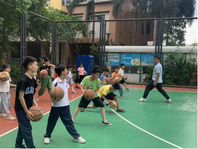 在篮球教学课,实践团老师教授青少年运球、投球的正确姿势与方法,让他们收获了户外运动的快乐;