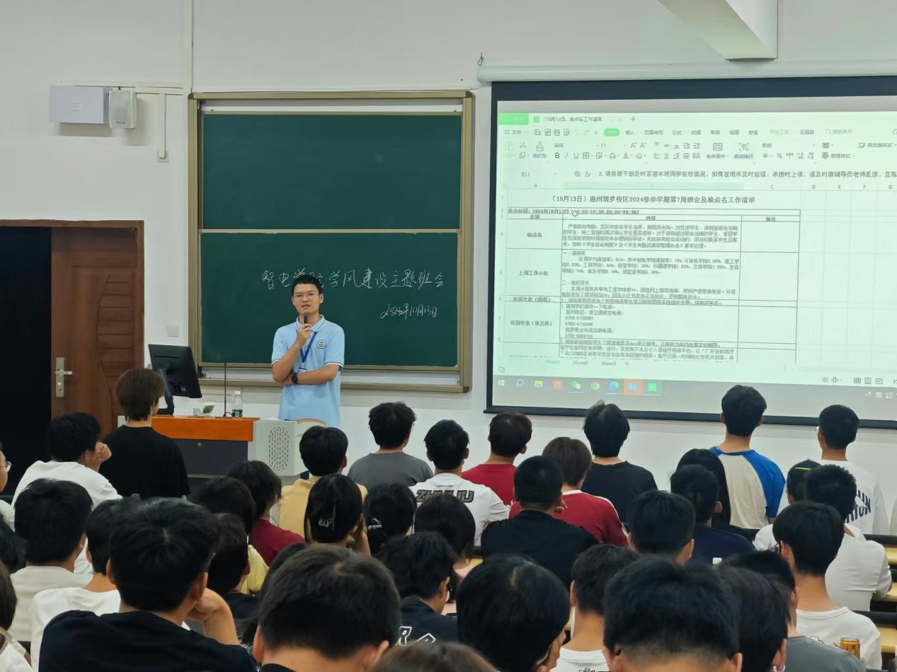 10月13日晚,KY开元集团全体2024级同学在惠州校区教学楼召开学风建设主题班会,班会由各班辅导员老师主讲。