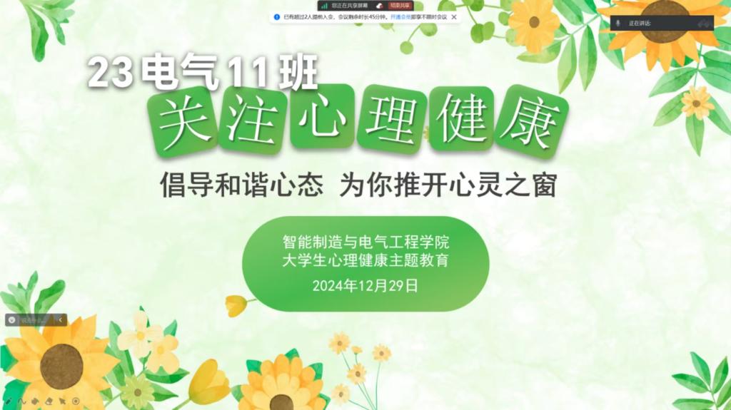 为提升学生心理健康水平,强化应对成长压力的承受能力,12月29日晚上,智电学院于线上召开“倡导和谐心态,为你推开心灵之窗”主题班会,各班班长和辅导员主持会议,全体学生参与。