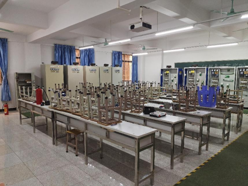位于12-404的中级电工实训室主要承担电气工程及其自动化、自动化两个专业及相关电类专业的实训教学任务。能满足《电工学》、《电工电子技术》、《PLC原理与应用》等课程的实训教学要求,具备电工培训实践操作、考核鉴定的电力拖动控制等项目,具备点动控制、按钮自锁、互锁和双重互锁、串电阻降压启动控制、电机正反转、反接制动、能耗制动等功能。