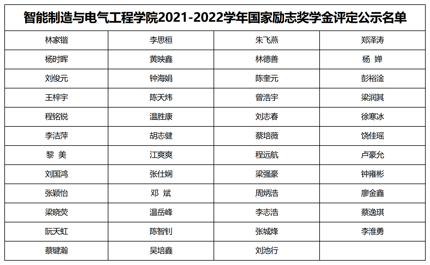 根据《关于开展2021—2022学年国家励志奖学金评选工作通知》(广州理工助函〔2022〕7号),经过学院严格评选,林家锴等47名同学获得2021—2022学年国家励志奖学金,现对名单进行公示,公示时间从2022年9月21日至2022年9月24日。如对公示内容有异议,请在公示期间内向智电学院办公室反映。反映情况时请提供具体事实材料并签署真实姓名,不提供具体事实材料和不签署真实姓名的,将不予受理。