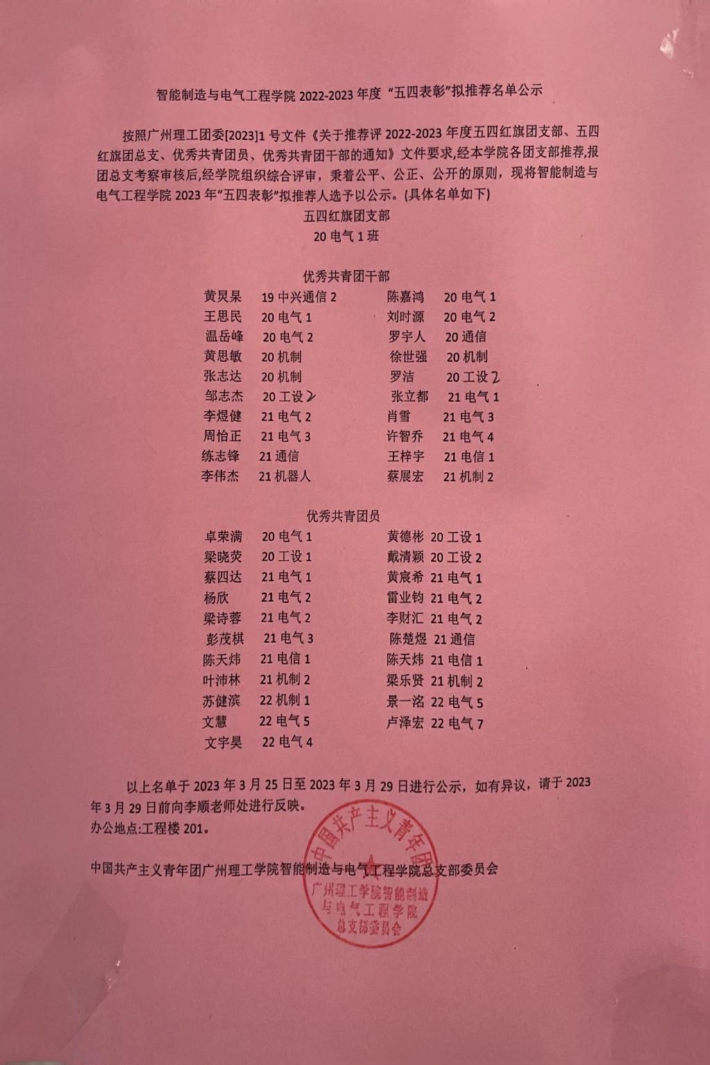 根据《关于推荐评选2022-2023年度五四红旗团支部、五四红旗团总支、优秀共青团员、优秀共青团干部的通知》文件要求,经学院各团支部推荐、学院初审,现将拟推荐名单进行公示,公示期为2023年3月25日至2023年3月29日,如有异议,请于2023年3月29日前向李顺老师处进行反映,办公地点:工程楼201。