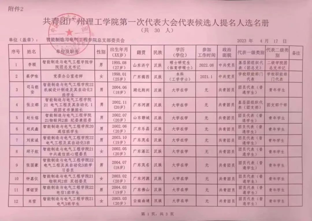 为落实《关于做好共青团广州理工学院第一次代表大会代表推荐选举工作的通知》,切实做好共青团广州理工学院第一次代表大会代表推荐选举工作,经层层推选、充分协商、组织考察后,现对候选人提名人选予以公示,公示名单如下。