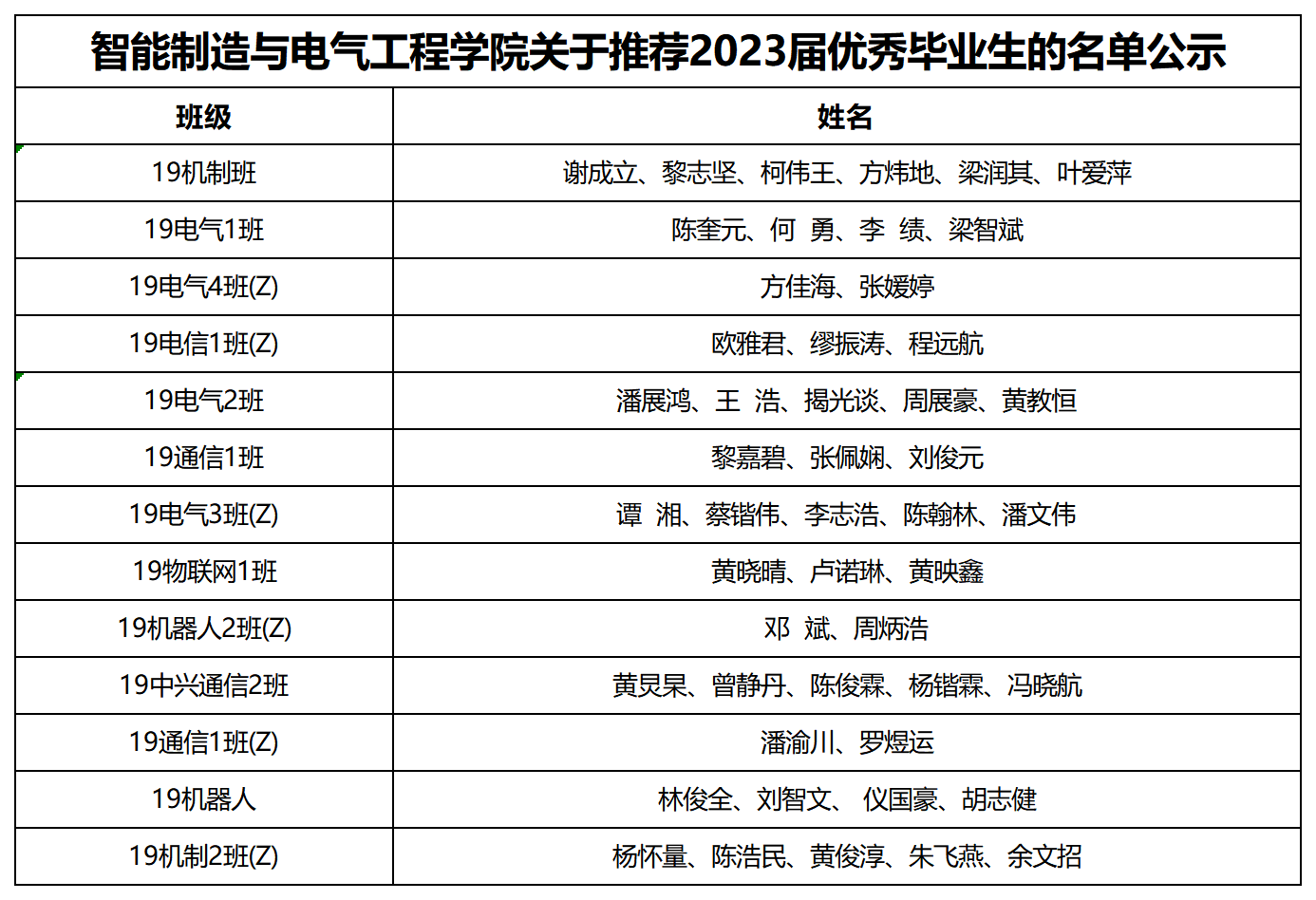 根据《广州理工学院办公室关于评选2023届优秀毕业生的通知》文件要求,经个人申报、班级推荐、学院初审,学院拟推荐以下49位同学参加学校2023届优秀毕业生评选,以上名单于2023年5月4日至2023年5月6日进行公示,如有异议,请于2023年5月6日前向老师反映:况老师;办公地点:工程楼201。