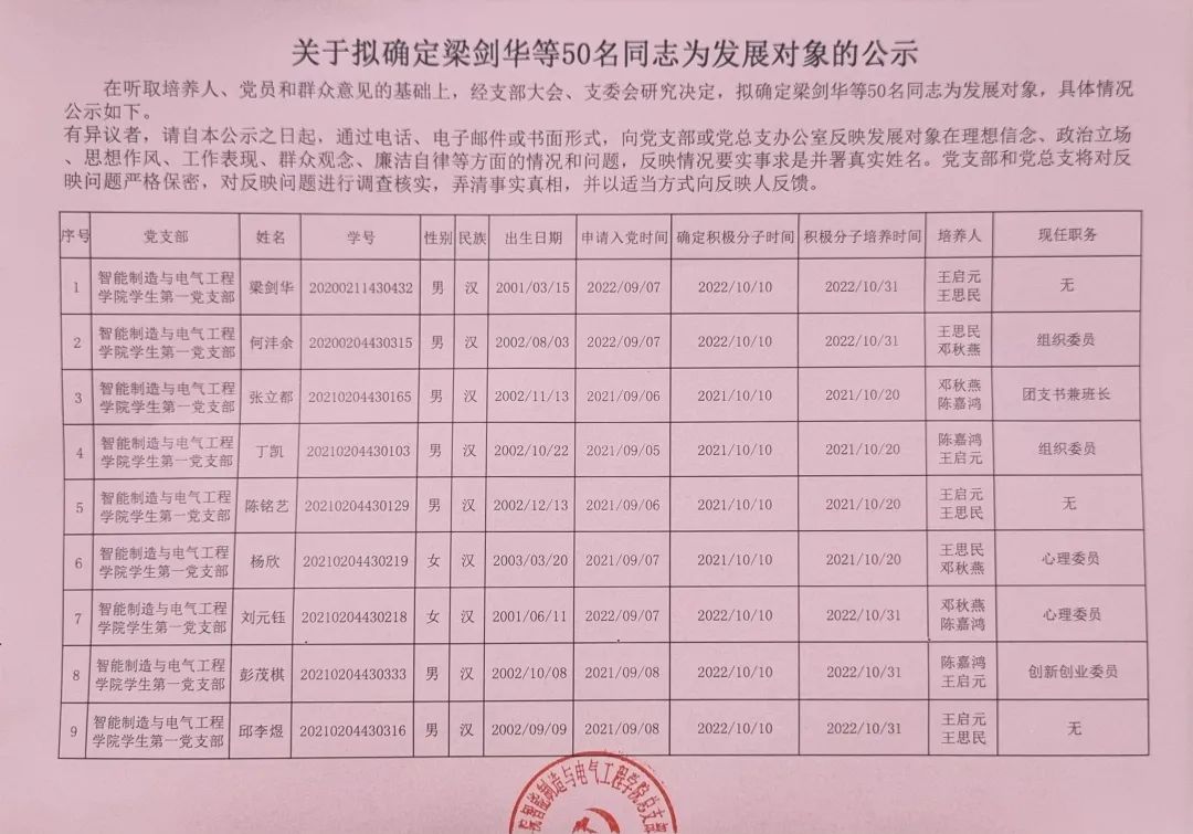在听取培养联系人、党员和群众意见的基础上,经支部大会、支委会研究决定,拟确定梁剑华等50名同志为发展对象,具体情况公示如下。有异议者,请自本公示之日起,通过电话、电子邮件或书面形式,向党支部或党总支办公室反映发展对象在理想信念、政治立场、思想作风、工作表现、群众观念、廉洁自律等方面的情况和问题,反映情况要实事求是并署真实姓名。党支部和党总支将对反映问题严格保密,对反映问题进行调查核实,弄清事实真相,并以适当方式向反映人反馈。