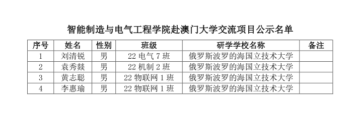 根据《广州理工学院学生处关于选派优秀学生赴俄罗斯波罗的海国立技术大学短期研习的通知》,经前期学生自愿报名,学院审核把关,拟推荐刘清锐等4位同学赴俄罗斯波罗的海国立技术大学开展学术交流活动,拟派出学生名单如下,公示期为2023年11月8日至2023年11月10日。期间若对该名单有异议,请在公示期间内向智电学院办公室反映。反映情况时请签署真实姓名和联系电话,有具体事实;不签署真实姓名或不提供具体事实材料的,将不予受理。