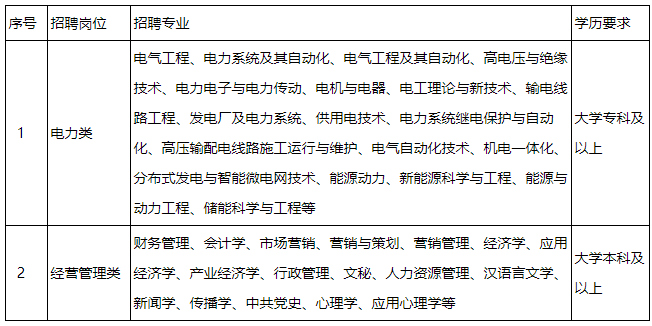 备注:电力类招聘岗位,可适当招收部分优秀的中专、中技、高技学历应届毕业生。招录的此类毕业生将全部安排至施工企业一线班组岗位,且在一线班组连续工作年限不少于 8 年。