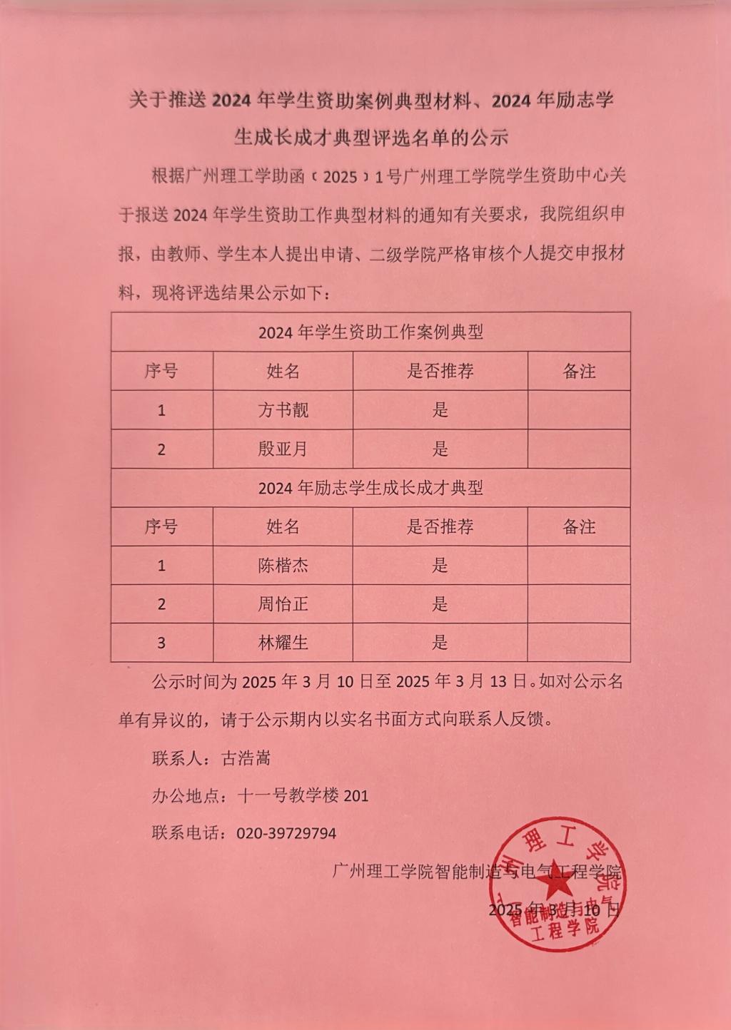 根据广州理工学助函﹝2025﹞1号广州理工学院学生资助中心关于报送2024年学生资助工作典型材料的通知有关要求,我院组织申报,由教师、学生本人提出申请、二级学院严格审核个人提交申报材料,现将评选结果公示如下: