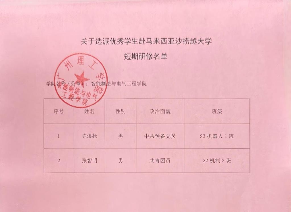 根据广州理工学院《关于选派优秀学生赴马来西亚沙捞越大学短期研修的通知》文件要求,我院通过宣传和组织申报,经学生本人提出申请、学院严格审核后推选出2名符合条件的学生,现将名单予以公示,具体如下: