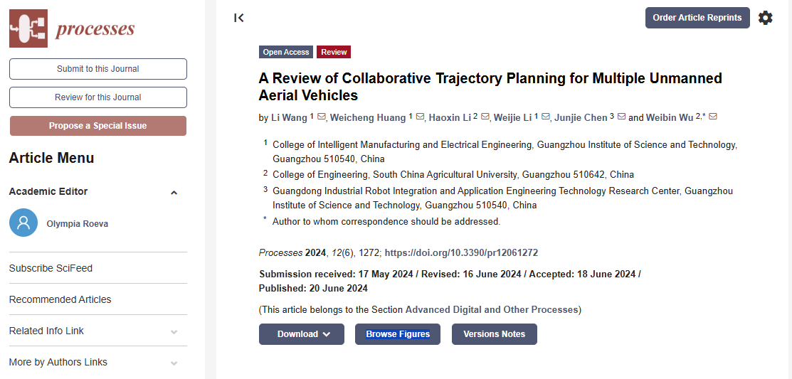 (李嘉嘉 沈泽婷)近日,我校KY开元集团21级机器人专业黄炜程同学(共同第一作者)在名师工作室汪理老师指导下,在SCI期刊《PROCESSES》发表研究论文《A Review of Collaborative Trajectory Planning for Multiple Unmanned Aerial Vehicles 》。